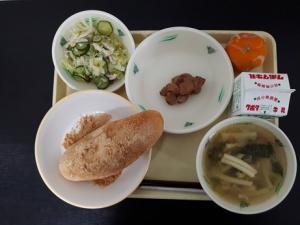 ご飯 きゅうりの梅和え かぼちゃコロッケ 具だくさん味噌汁 牛乳 |
