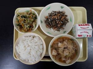 麦ご飯 小松菜のごま和え 揚げぶり大根 具だくさん生姜汁 牛乳 |
