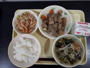 ご飯 レンコンの酢の物 豚肉と大根の味噌煮 わかめスープ 牛乳 |