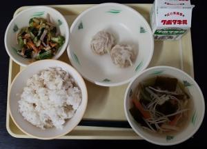五穀米 レモンドレッシングサラダ シュウマイ わかめスープ 牛乳 |