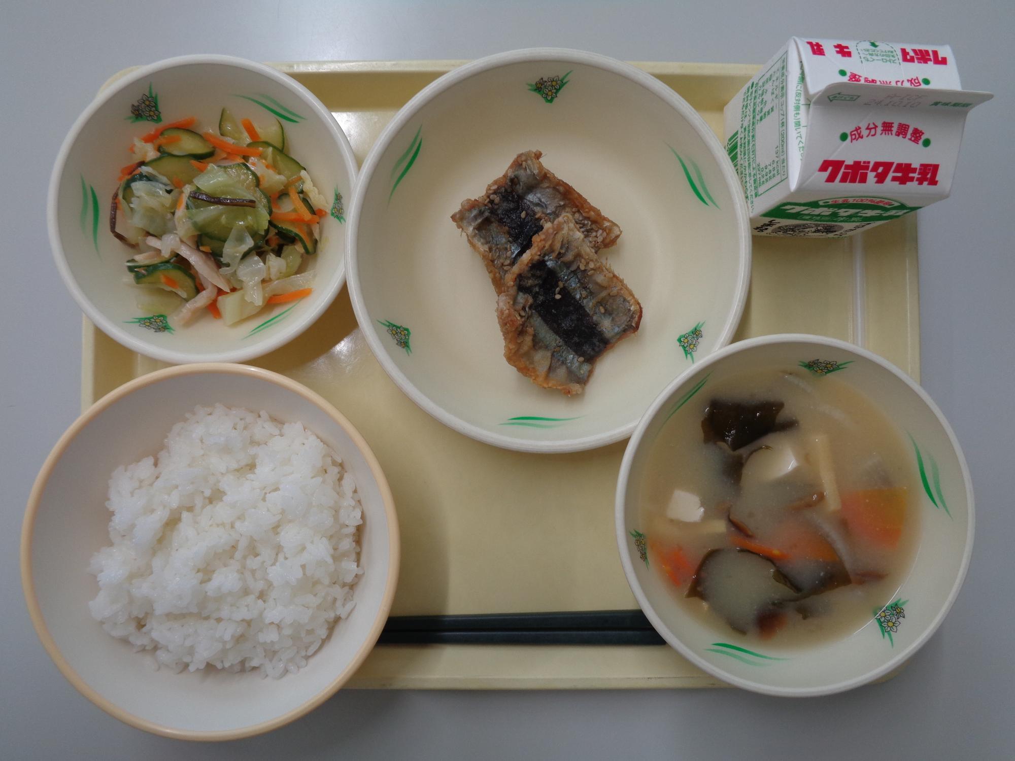 麦ごはん 牛乳 キムチ肉じゃが 小いわしの米粉揚げ おふのみそ汁 |