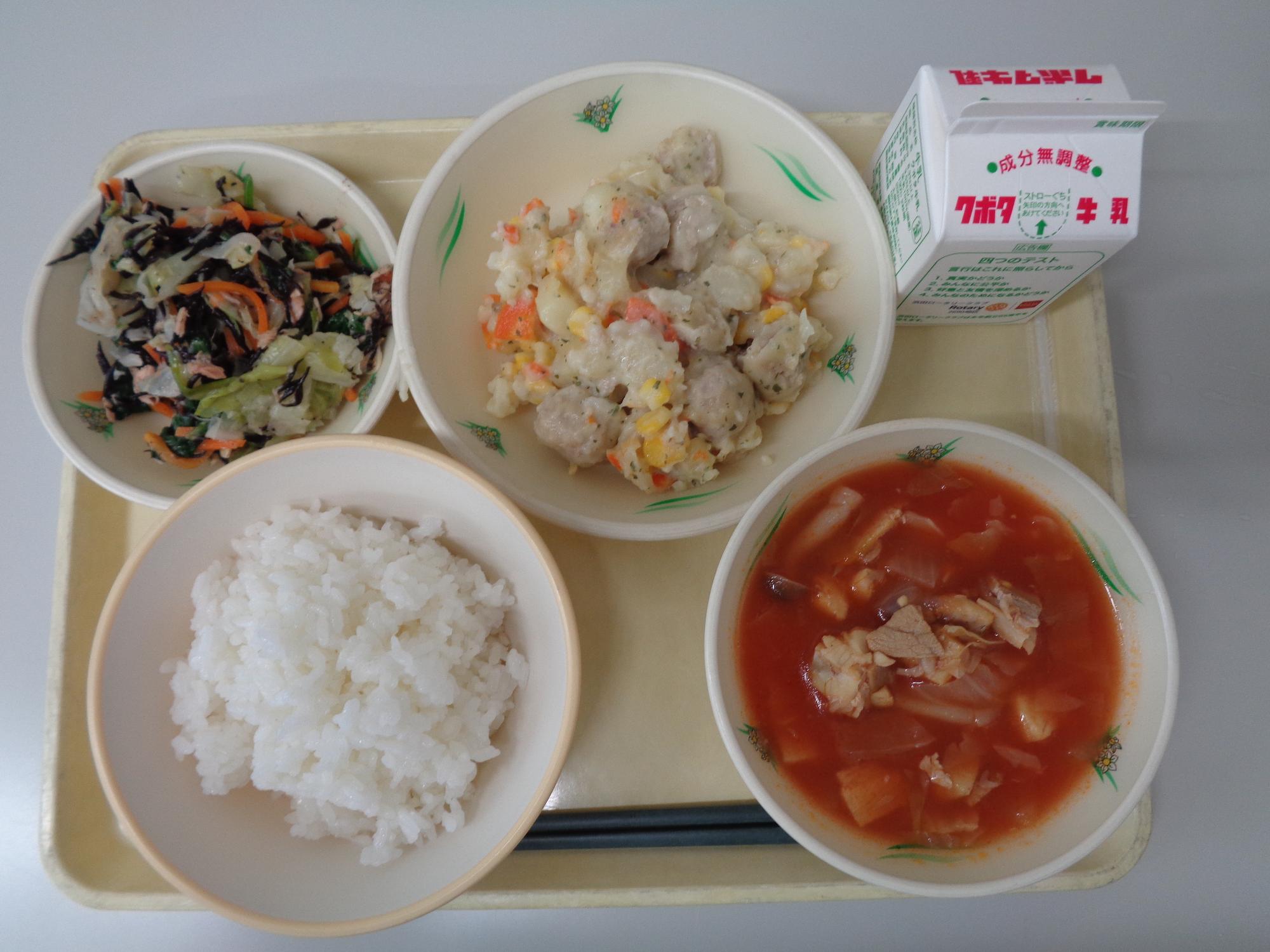 ごはん 牛乳 タコライスの具 じゃことアーモンドのサラダ ABCスープ |