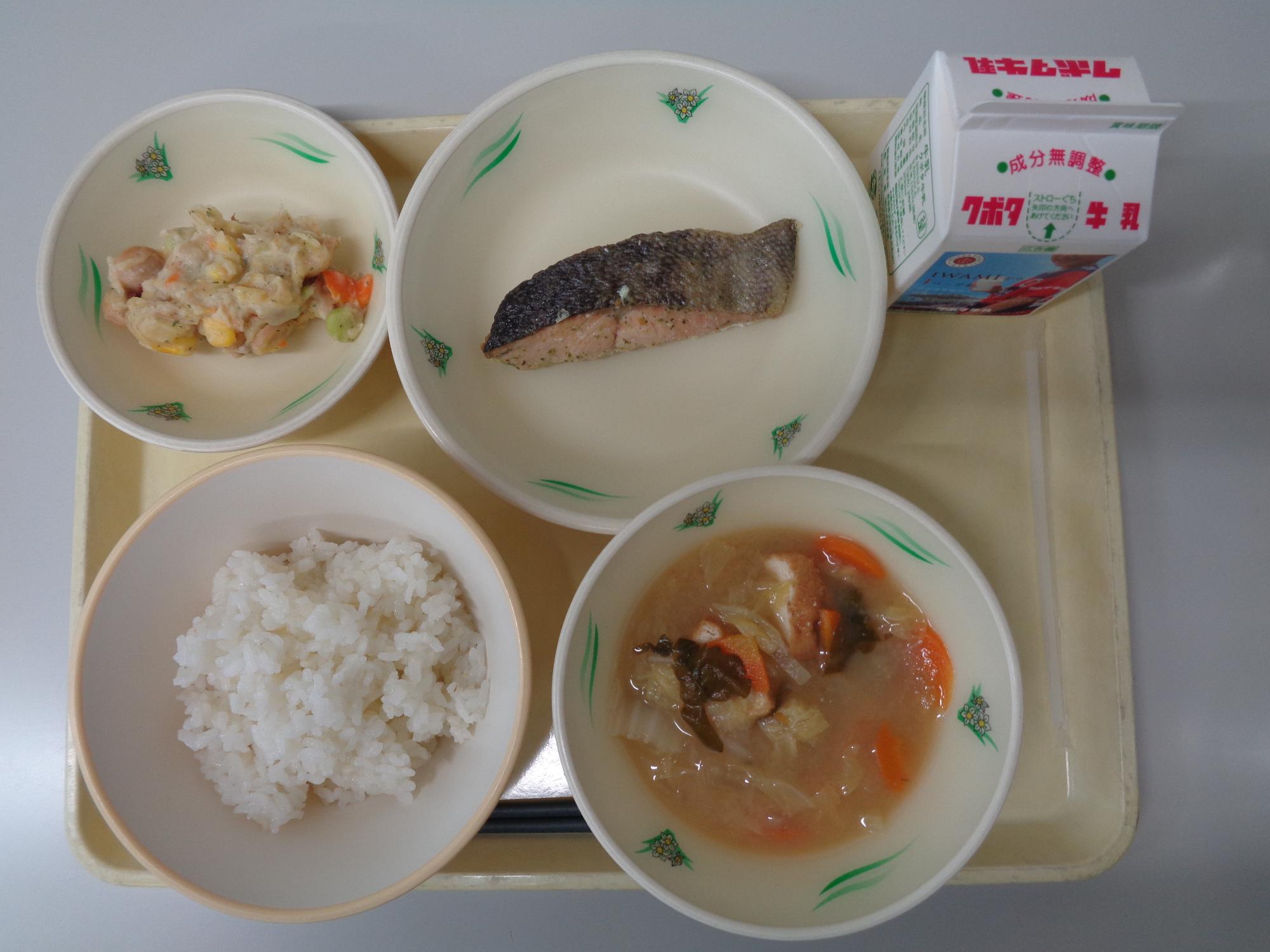 麦ごはん 牛乳 ガーリックサーモン お豆とポテトのチーズ煮 冬野菜のみそ汁 |