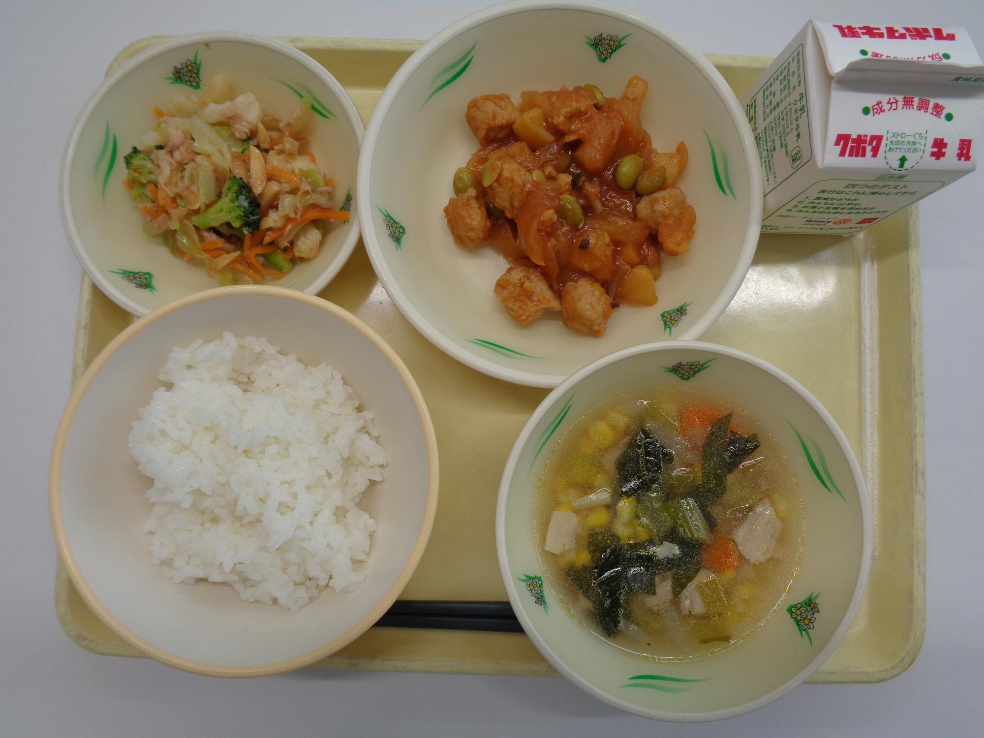 ごはん 牛乳 ミートボールのケチャップ炒め 花野菜サラダ ベーコンとコーンのスープ |