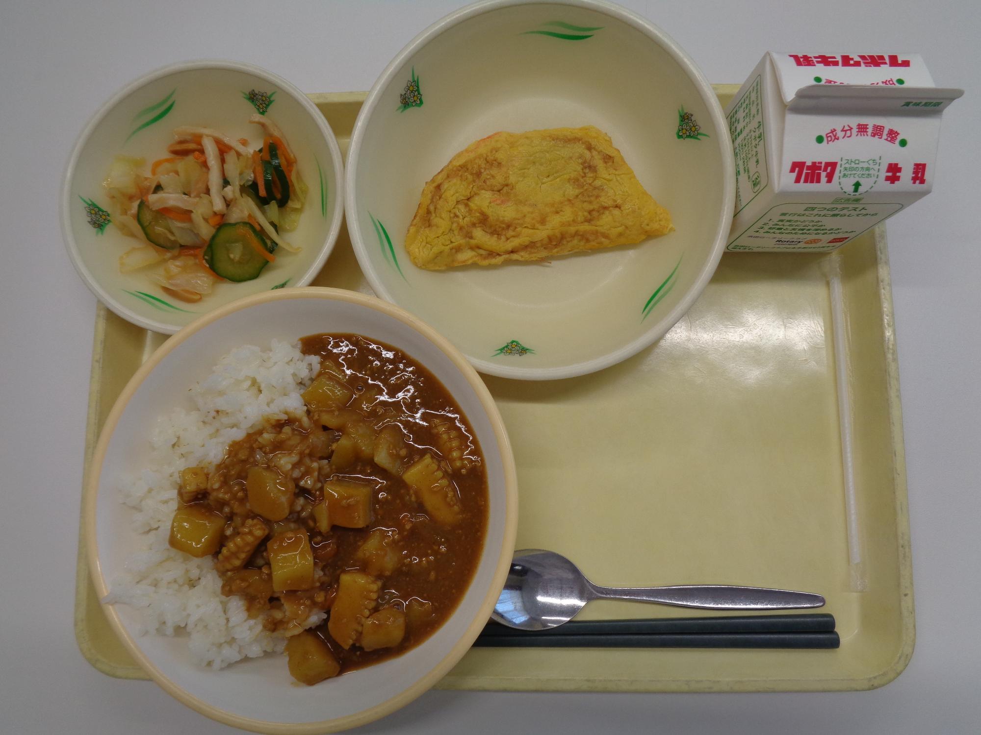 麦ごはん 牛乳 ●千草オムレツ アーモンド和え いかカレー |