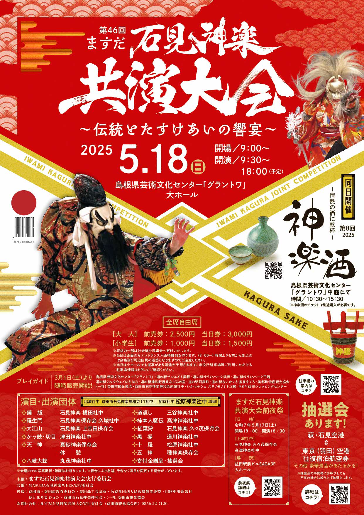 今年で第5回目となるMASUDA石見神楽WEEKはおなじみの「道中神楽ウォーク」に始まり、クロージングでは「ますだ石見神楽共演大会」を開催、また神楽酒も同時開催!